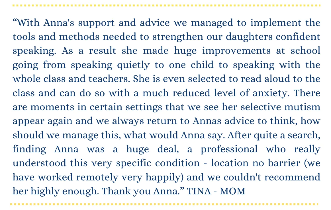 I am a Speech and Language Therapist with over 25 years of experience, specializing in supporting children with anxiety and selective mutism—a fear of speaking in specific situations.