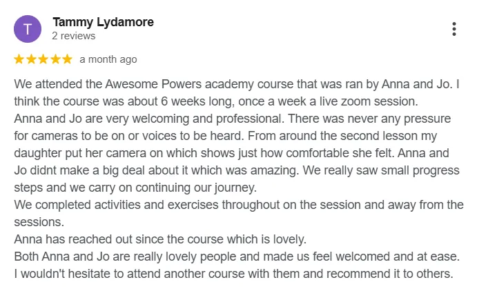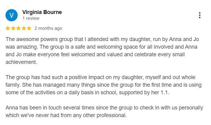 “We were really pleased to see a change in confidence and resilience in our ten year old daughter. We found Jo to be warm, kind and thoughtful and gave our daughter lots of practical ideas and tools to use to navigate her way through everyday challenges which used to be overwhelming. Would recommend to other parents or guardians with children who are perhaps struggling with their confidence and self-worth.”